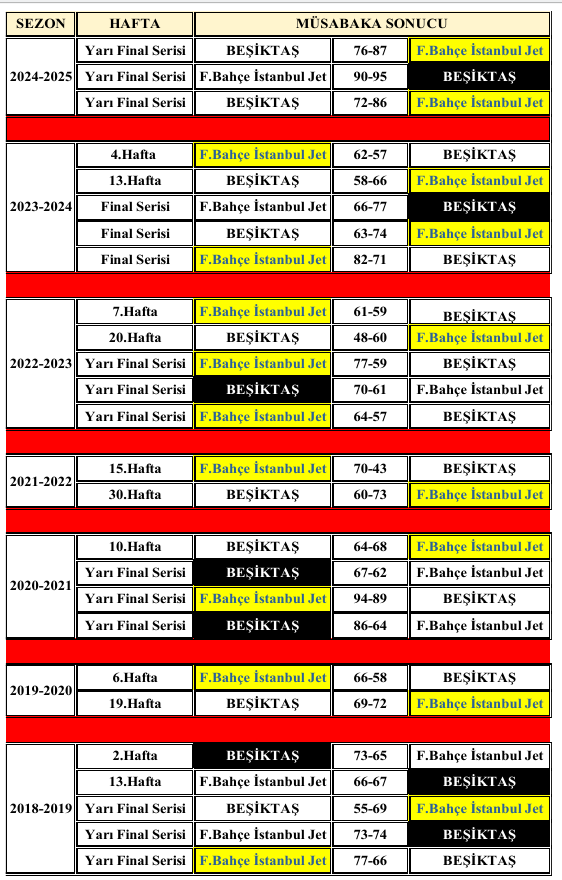 2018-2019 sezonundan itibaren takımlar ,26 kez karşı karşıya geldi.Fenerbahçe İstanbul Jet 18 kez üstün gelirken,Beşiktaş ise 8 kez parkeden galip ayrılmayı bildi.