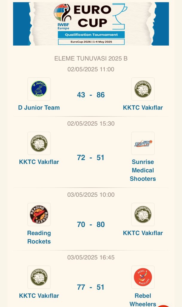 Eleme Turnuvası B Grubunda bugün oynadığı 3.maçta Reading Rockets takımını 80-70 mağlup eden KKTC Vakıflar grubun 4. ve son maçında Rebel Wheelers takımını da 77-51 yenerek grubunu namağlup bitirdi.